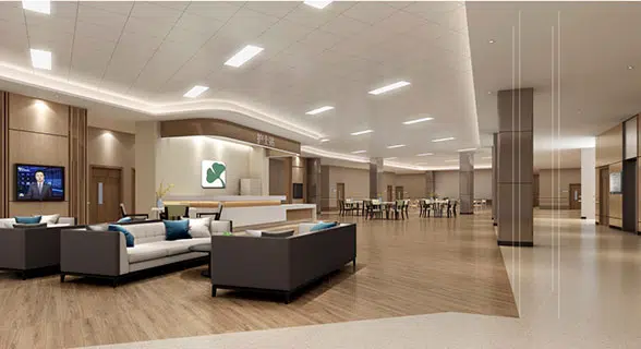 走廊通道设立扶手; 阳角采用圆弧处理; 7台电梯(3台医用电梯)
